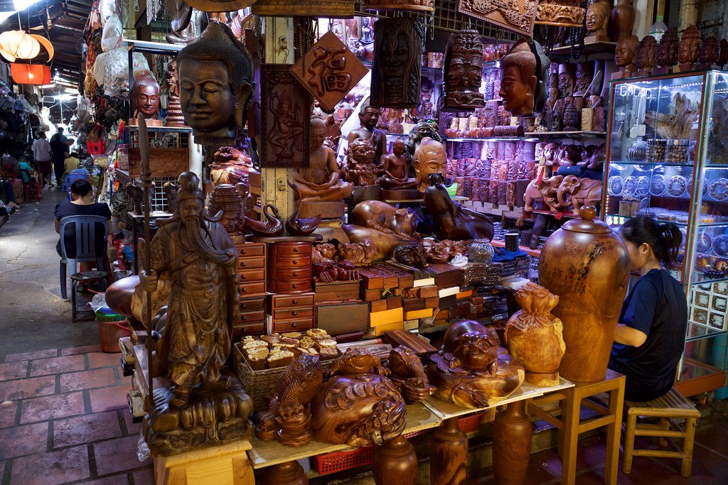 Continue to the Russian Market, named from the time when most foreigners in Cambodia were Russians. Bargain for souvenir gifts among the stalls selling silks, carvings, and curios.